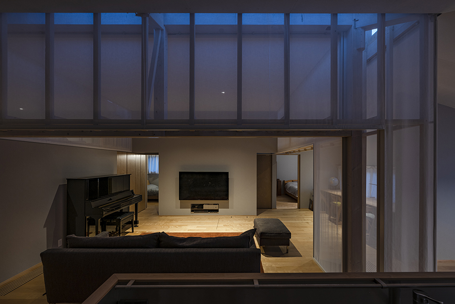 曇りの日には天空光で満たされた行燈のようになり、日が暮れ始めると夜の帳が織り込まれる。日々刻々と変わっていく、建築に包まれ、自然に包まれる、そんな住宅である。