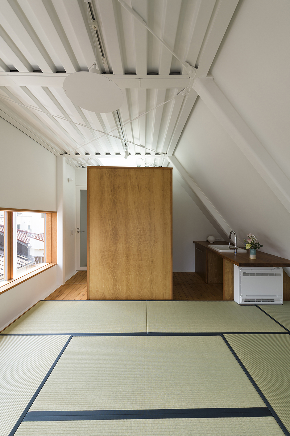 昭和8年から続く老舗の銭湯、小杉湯。その隣で、銭湯のある暮らしを提供する施設である。銭湯には、「人と話さなくてもいいけど、人とつながれる」、会話を前提としない静かなコミュニティがある。それは「ある集団に属する」というよりも、人々の営みが織り込まれた「環境に属する」といった感覚であり、その環境が小杉湯においては、男湯と女湯にまたがって架かる大きな越屋根によって生まれる上空にあって、太陽の光を取込み、風が抜け、くぐもった湯気が立ち込め、匂いを溶かし、音を響かせている。室内だけど上空があるような、この独特な環境のあり方を展開して、銭湯的なコミュニティを拡張したいと考えた。